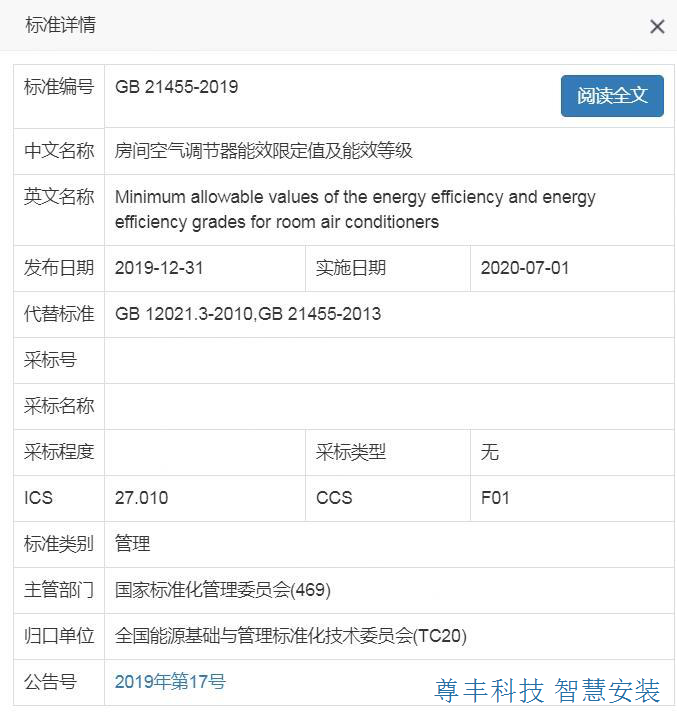 2019年12月31日,國家市場監督管理總局(國家標準化管理委員會)批準了32項國家標準,并予以公布。其中,GB 21455-2019《房間空氣調節器能效限定值及能效等級》予以批準,于2020年7月1日起施行。這標志著此前備受行業關注且遲遲未能發布的家用空調新能效標準終于正式發布。