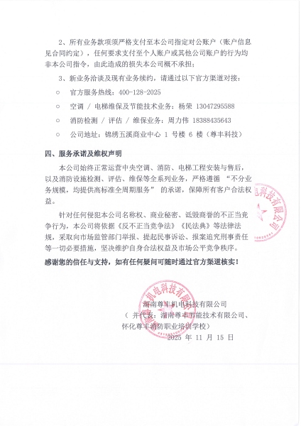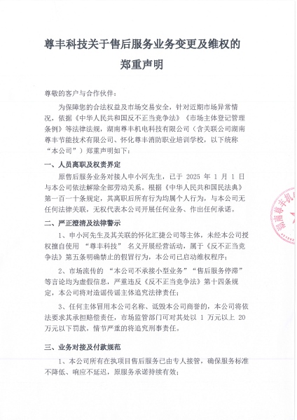 尊豐科技關于售后服務業務變更及維權的鄭重聲明